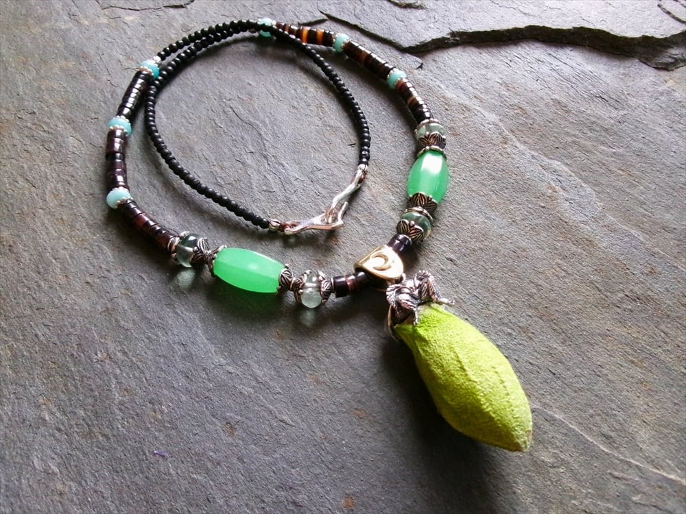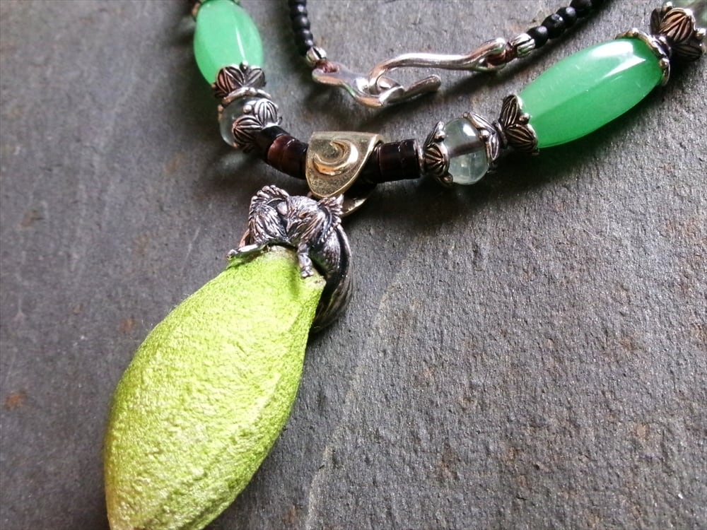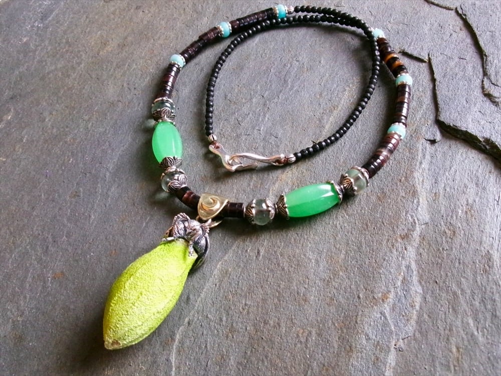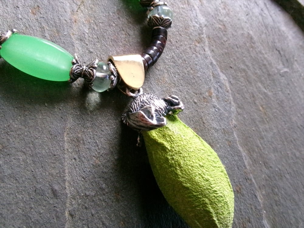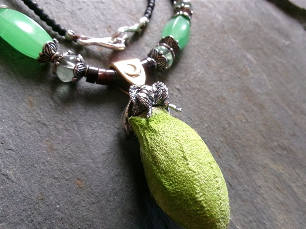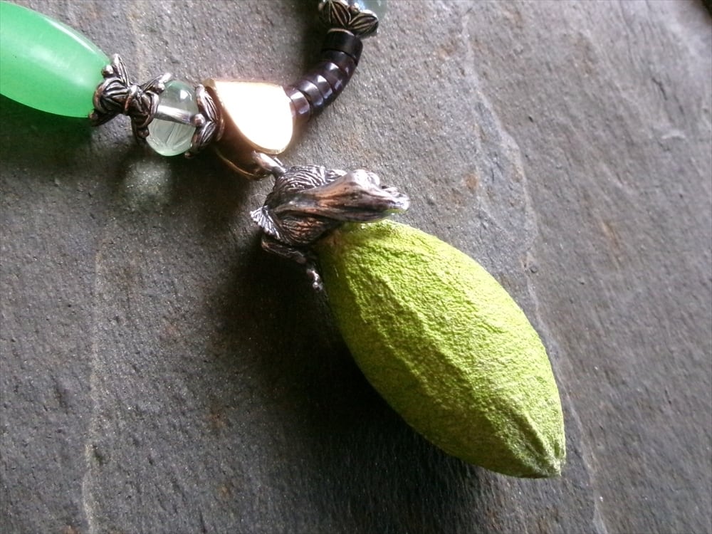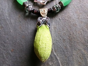 ネックレス部分に、繭に似た雰囲気を放つアンティークのウランガラスビーズを使用しました。