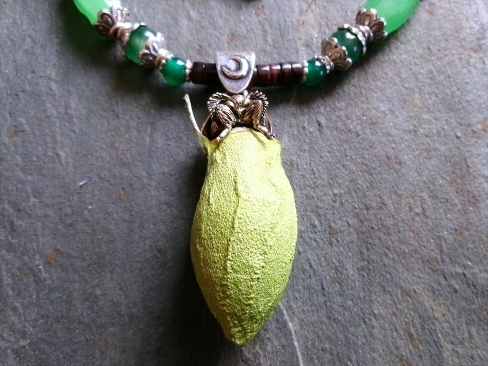 ウスタビガの羽化後の繭をメイン素材に使用したペンダント。
