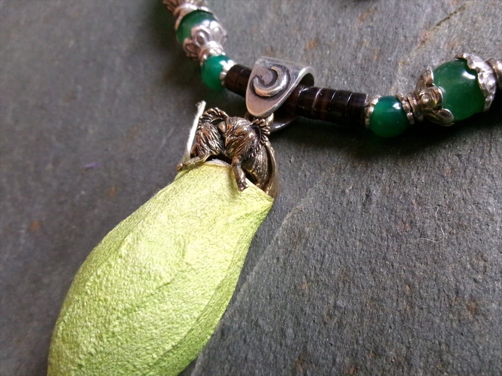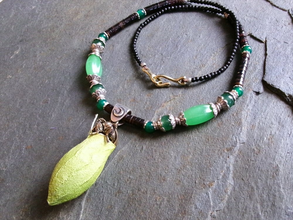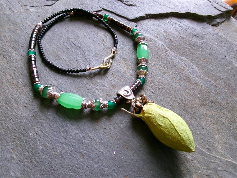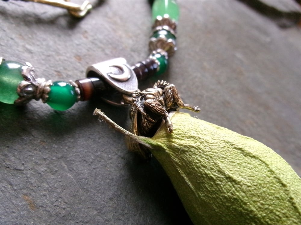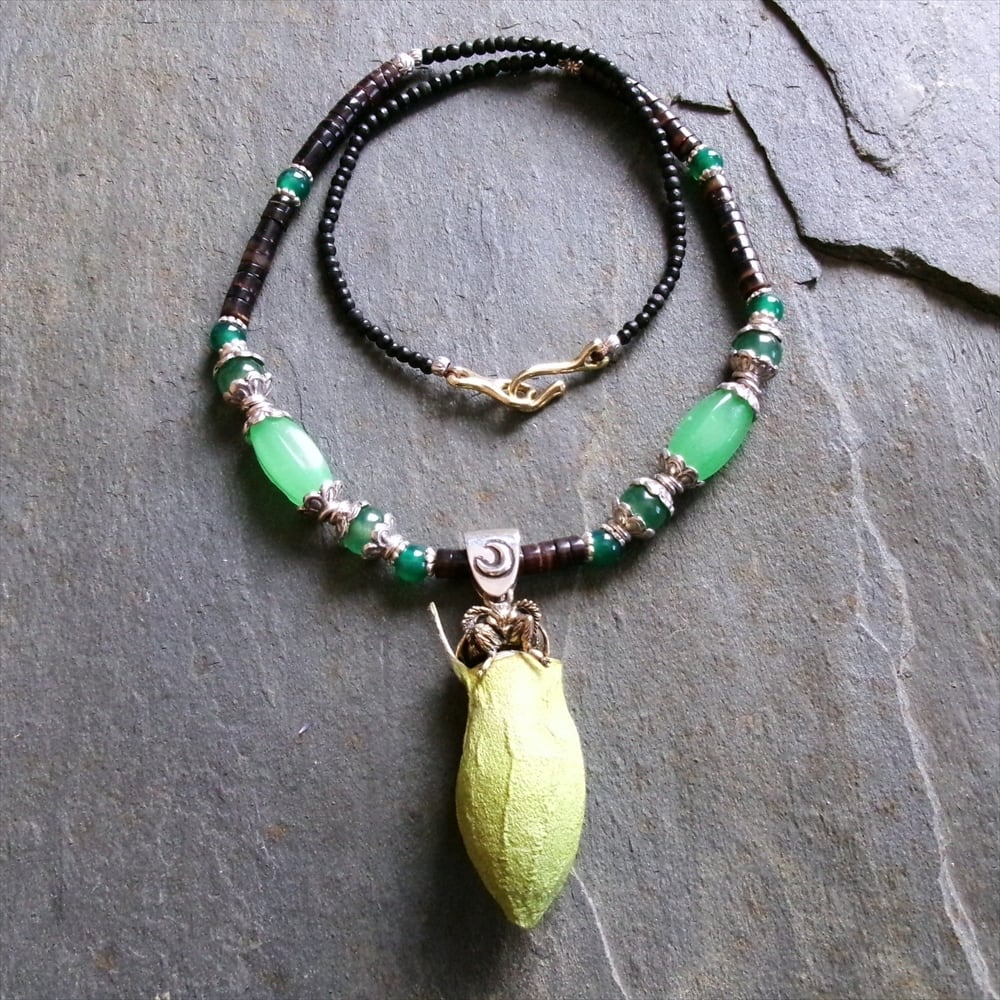 (トップ[真鍮、㏜925]、ウスタビガの繭、シルバーパーツ、カレンシルバー、グリーンアベンチュリン、グリーンオニキス、ウランガラス、シェルビーズ、ウッドビーズ)