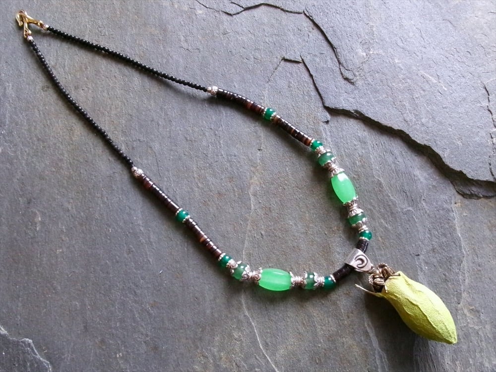 ネックレス部分に、繭に似た雰囲気を放つアンティークのウランガラスビーズを使用しました。
